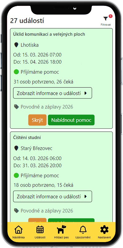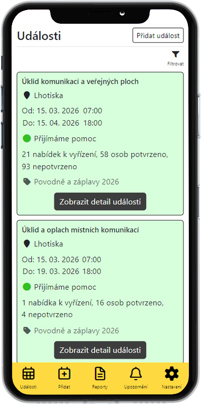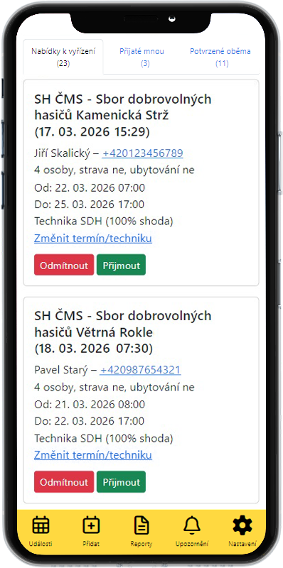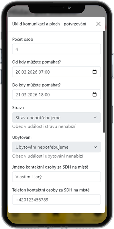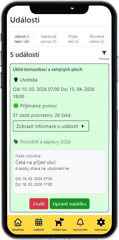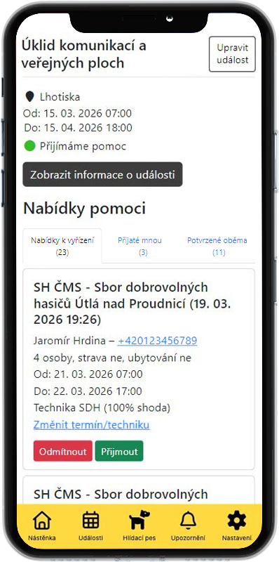Obec vytvoří událost a SDH reagují nabídkami dobrovolné pomoci vybraným obcím (počet nabídek není omezen). Obce nabídky přijmou/nepřijmou.
